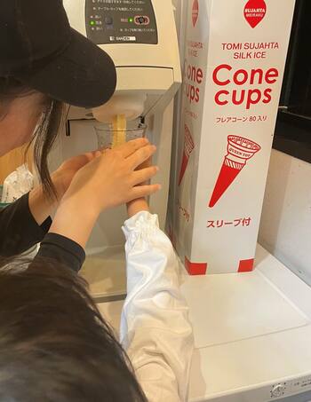 食事も終盤にさしかかり、ソフトクリームチャレンジを注文すると、店員のお姉さんが「じゃあ、一緒に作りに行こうか!何の味がいいかな?」と我が子に声をかけてくれた。