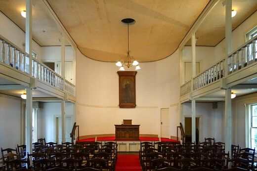 だが中に入ると、そこが江戸時代には存在しなかった、新しい空間であることがすぐにわかる。建物中央は1・2階吹き抜けで、正面には演台が設けられている。大勢の人々が集まり、話を聞くことを前提とした空間になっているのだ。