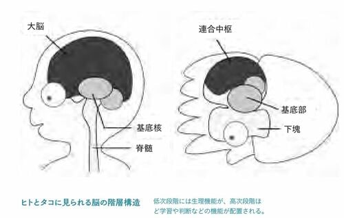 このようにコウイカの脳も低次、中次、高次といった階層性を持ち合わせており、やはりヒトの脳と同じく、原始的で古い能力に関する場所もあれば、新たに生まれた部位もある。このような脳の階層性は、脳そのものの作りはかなり違うとはいえ、タコにもヒトにも共通して存在している。