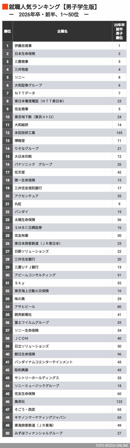 キャリア・教育 #就職四季報プラスワン 前の記事 次の記事 2万人が投票した「就活生に人気が高い会社」ランキング…「男子・女子・文系・理系」TOP100社 4分で読める 公開日時:2025/04/21 05:00 東洋経済オンライン編集部 フォロー 1/9 PAGES 2/9 PAGES 男子学生1〜50位 次ページが続きます 3/9 PAGES 4/9 PAGES 5/9 PAGES 6/9 PAGES 7/9 PAGES 8/9 PAGES 9/9 PAGES