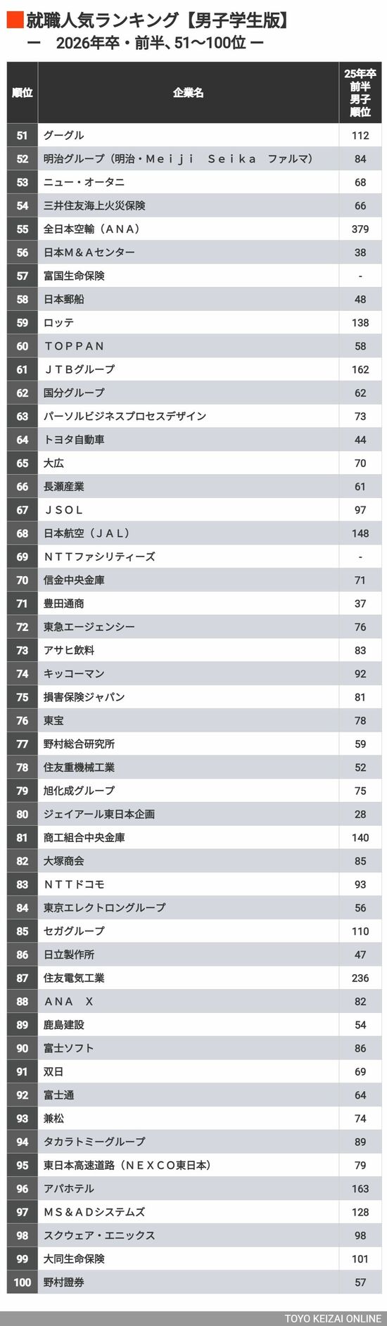 キャリア・教育 #就職四季報プラスワン 前の記事 次の記事 2万人が投票した「就活生に人気が高い会社」ランキング…「男子・女子・文系・理系」TOP100社 4分で読める 公開日時:2025/04/21 05:00 東洋経済オンライン編集部 フォロー 1/9 PAGES 2/9 PAGES 3/9 PAGES 男子学生51〜100位 次ページが続きます 4/9 PAGES 5/9 PAGES 6/9 PAGES 7/9 PAGES 8/9 PAGES 9/9 PAGES