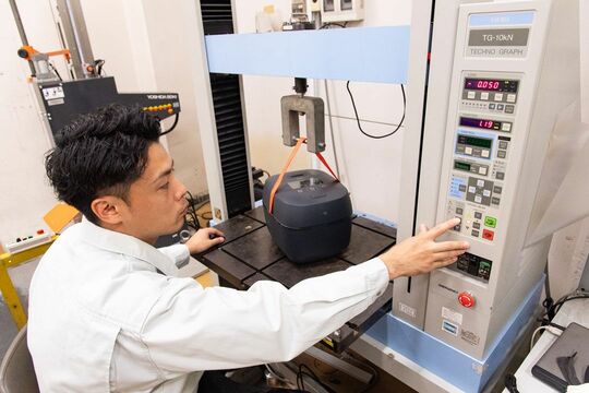 圧力検査を徹底し、各種安全弁の強度を検証。使用上の想定を超える強さで圧力をかけ、どのくらいの強さでどの部品が壊れるかを検証し、補強対策に活かしている。圧力試験だけでなく、ふたの開閉試験、スイッチの作動試験、炊飯ジャーの落下試験など、試験項目は多岐にわたる。