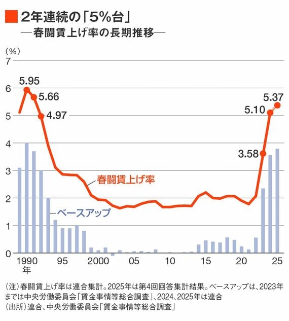 2025年の春闘賃上げ率が、33年ぶりの高水準となった2024年(5.10%)に続き5%台となることはほぼ確実とみられる。