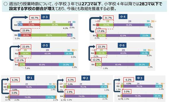 全国の小中学校は、どのくらいの授業をしているのだろうか。文科省によると、2024年度の計画段階については、2022年度の計画と比べると、授業数が比較的少ない学校は増える傾向にあるものの、小学校4年生以上(中3まで)では週29コマ以上の学校が多い。