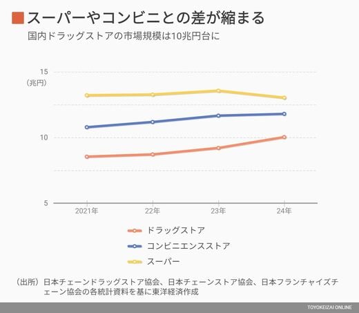 ドラッグストア業界は近年、目まぐるしい変化が続いている。日本チェーンドラッグストア協会の実態調査によると、ドラッグストアの市場規模は2024年に10兆0307億円(推定値)に達し、スーパー(業界団体の統計で2024年は約13兆円)やコンビニエンスストア(同 約11兆7900億円)に迫る勢いで拡大した。