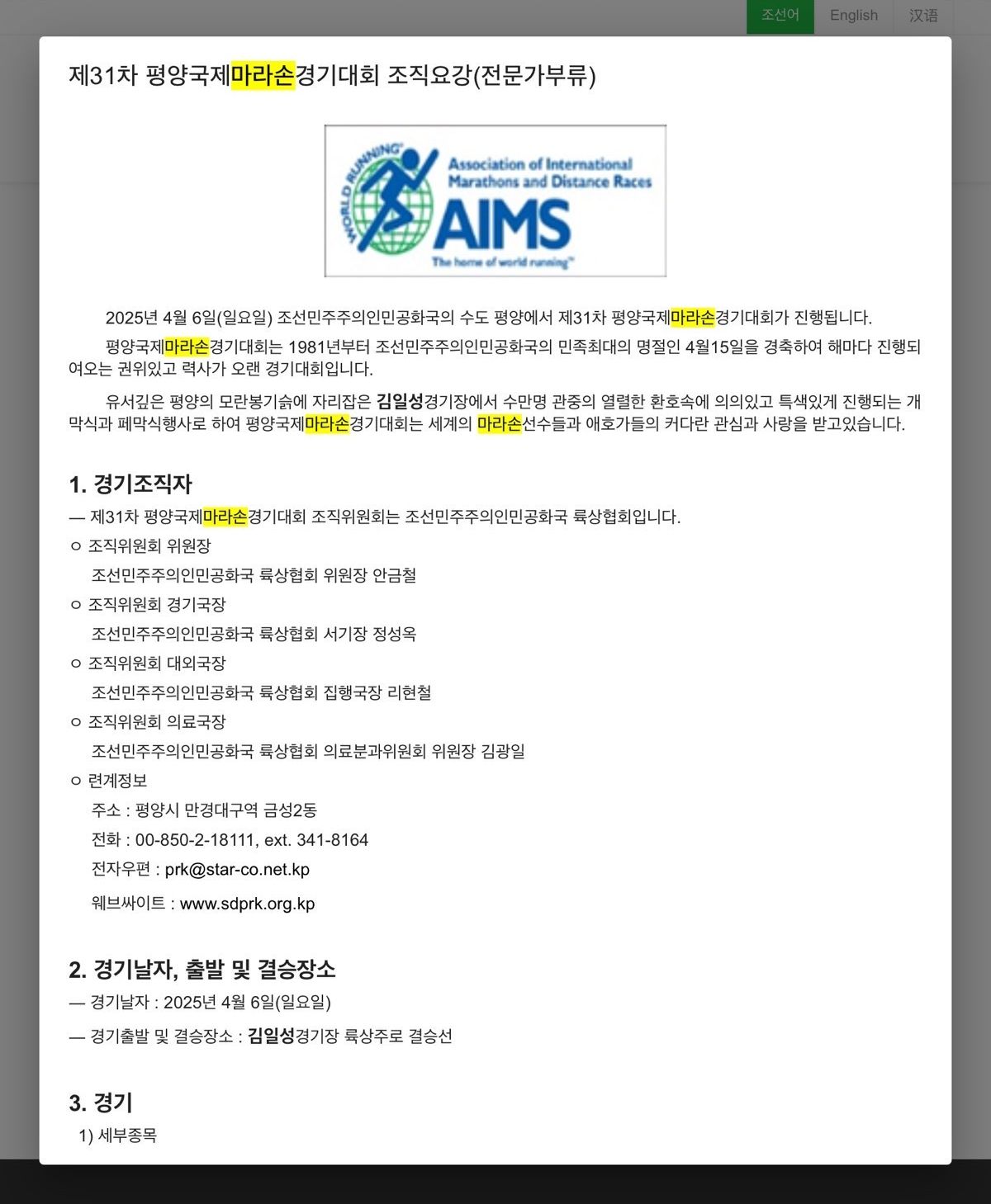 2025年4月、北朝鮮の平壌で実施された国際マラソンの要綱(写真・筆者)