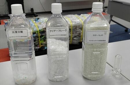 すると、キャップ部分のプラスチックは浮く一方でペットは沈み、これによりペットが取り出され、乾燥させると「フレーク」になる。このフレークを加熱溶融して品質を均一化すると粒状の「ペレット」が生成されてくる。