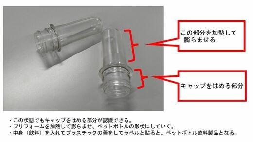 「ボトルtoボトル 水平リサイクル」を行う場合は、このペレットを基にペットボトルの卵となる「プリフォーム」を生成する。このプリフォームを金型にはめて熱風を入れて風船のように膨らませてペットボトルを作り出し、「ボトルtoボトル」による水平リサイクルが実現するのだ。
