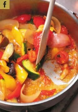 ラタトゥイユを例にあげると、ズッキーニとなす、パプリカは乱切りにしていますが、これは、ボリューム感を出しながら、それぞれの野菜に均等に火が入るようにするためです。