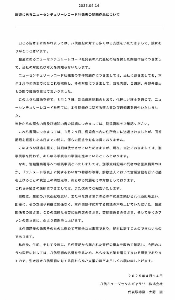 今回のコラムは、ただニューセンチュリーレコードの社長を糾弾したいのではなく、難しいことは承知で、「自身の言動や置かれた状況、そして、時代の変化や故人の尊厳を守ることについて、少しでも客観視してもらう機会になれば」という思いを込めて書きました。