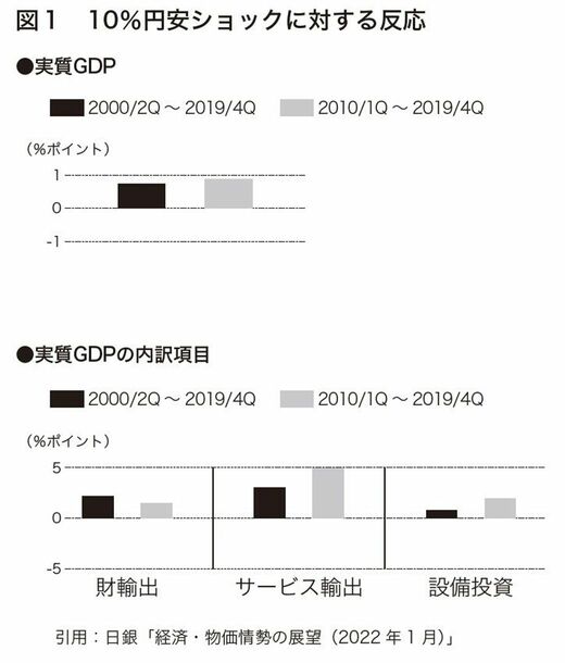 その際、近年の経済構造変化の可能性を考慮し、(1)感染症拡大前までの20年間(2000~2019年)と、(2)その後半10年間(2010~2019年)の2パターンに分けて推計結果が出されていますが、いずれの試算でも、実質実効レートに10%の円安が加わった場合は1%弱程度、実質GDPにプラスの影響を与えていることが示されました(※外部配信先では図を閲覧できない場合があります。その際は東洋経済オンライン内でお読みください)。