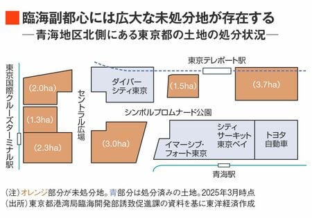 エリア内には、都が都市開発を想定して民間事業者への売却などを前提に保有してきた都有地があり、青海と有明北地区にはまだ処分に至っていない土地が計約34万㎡分(2023年度末時点)存在する。