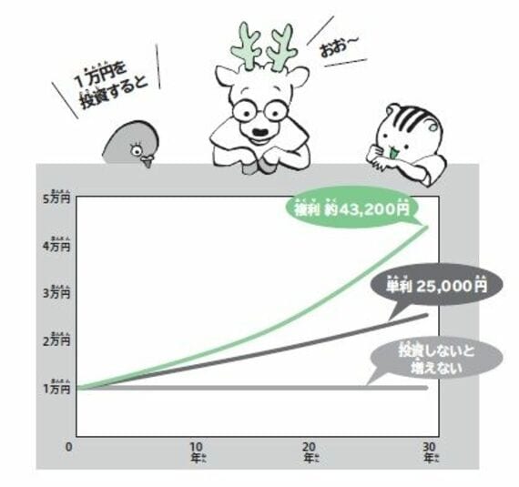 時間が経つほど効果を発揮するので、10年、20年経つと、大きく差がつくのです。1万円を金利5%の単利で30年間投資したら2万5000円ですが、複利だと4万3219円! 株式や債券(元本金利確定型)、投資信託(無分配型)などは複利効果が得やすい金融商品です。