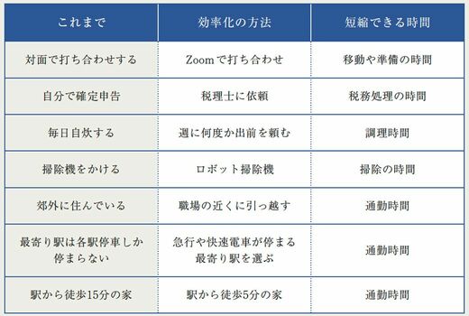 いつもの作業や行動を効率化することで、これまでかかっていた時間を短縮し、空いた時間を別のことに使えるようになります。