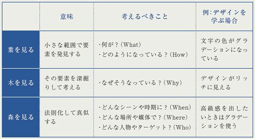 中でも効率的にやり方を学ぶ方法は、自分が求めているスキルを持っている人や結果を出している人を見つけてよく観察し、分析して真似をすること。コツは「葉を見る→木を見る→森を見る」です。