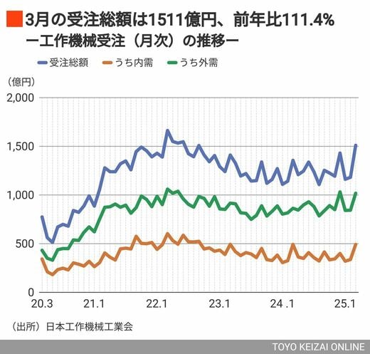 受注総額は1511.0億円で、前月比プラス27.8%、前年同月比プラス11.4%という数字に。前年同月比は6カ月連続のプラスになった。2022年9月以来、30カ月ぶりに1500億円を超えた。要因は年度末による受注押し上げ効果もあるが、インドや中国など外需が貢献している。