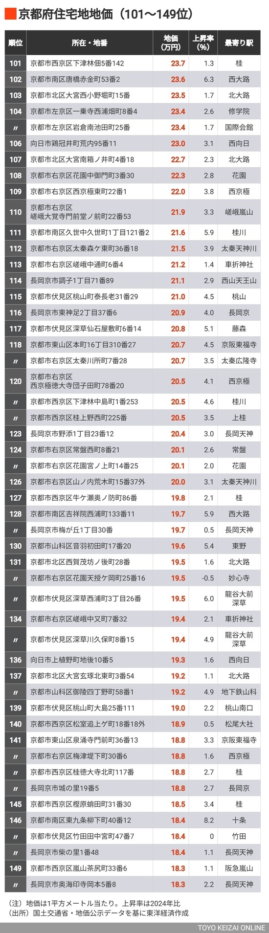 ライフ 5位が祇園四条、2位が今出川、では1位は? 地価の高い「京都府の住宅地」トップ201地点【2025年版】 3分で読める 公開日時:2025/04/30 07:00 東洋経済オンライン編集部 フォロー 1/5 PAGES 2/5 PAGES 3/5 PAGES 4/5 PAGES 100位台に入っても大半が京都市内 次ページが続きます:【最後に151~200位】 5/5 PAGES