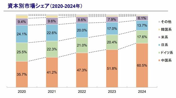 一方、日本メーカーは24.1%から13.7%へと低下し、これまで肩を並べていたドイツ系(2024年は17.6%)との差が拡大している。