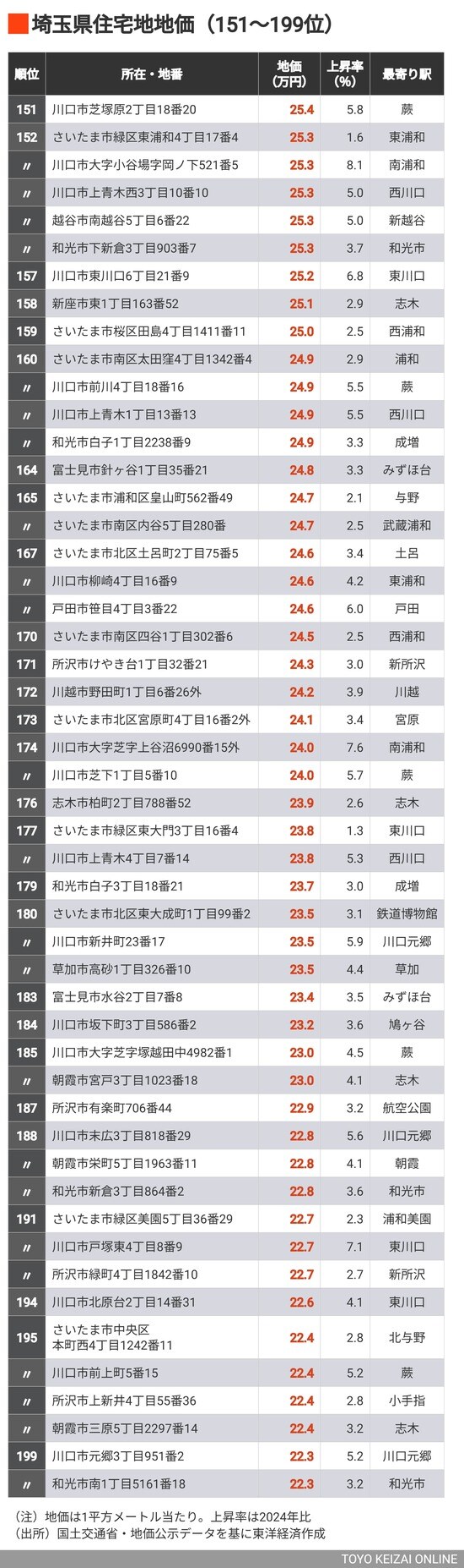 ライフ 3位が川口、2位は大宮、では1位は? 地価の高い「埼玉県の住宅地」トップ200地点【2025年版】 3分で読める 公開日時:2025/05/03 06:30 東洋経済オンライン編集部 フォロー 1/5 PAGES 2/5 PAGES 3/5 PAGES 4/5 PAGES 5/5 PAGES 越谷や草加など県東部もランクイン (外部配信先では画像をすべて閲覧できない場合があります。その際は東洋経済オンライン内でお読みください)