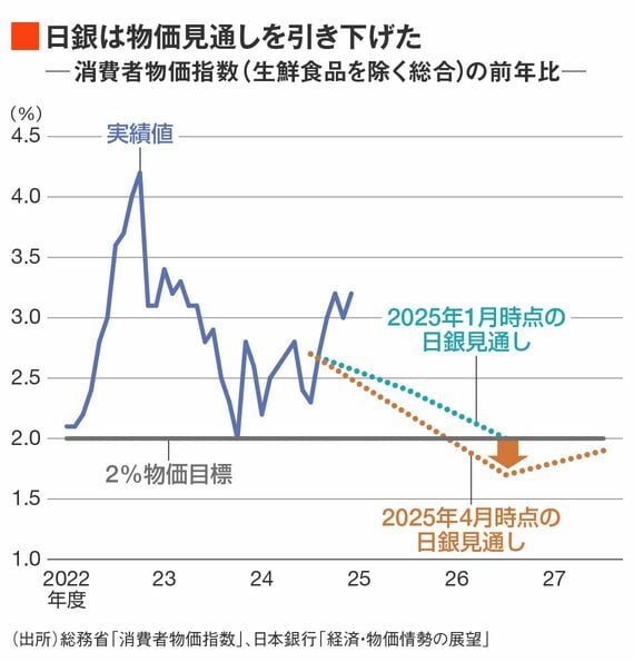一時的要因で上振れた消費者物価上昇率が2%まで下がる一方、基調的な物価上昇率は徐々に2%まで上がっていく――日銀はそんな未来予想図を示しながら、昨年3月に異次元金融緩和を終了して以降、昨年7月、今年1月と利上げしてきた。それはトランプ関税で白紙となった。