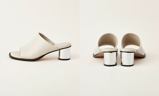 こなれた雰囲気が出るのは、本革を使用した5センチヒールのミュールサンダル。シンプルなデザインですが、ヒール部分のメタリック仕様がアクセントになっています。しかも表面に凹凸を施し、ニュアンスのある輝きが生まれるように計算されているのだとか。