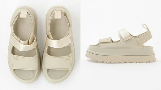 カリフォルニア発祥の人気ブランド「UGG(アグ)」のサンダルは4.4cmの厚底タイプ。甲部分は太めの面ファスナー仕様で、足首側のストラップは光沢のある素材を使っています。