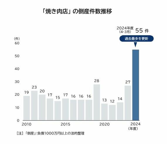 「じょうしょう」に限らず、焼き肉店の倒産は急増している。最新の倒産状況を見ると、2024年度は55件発生し、前年度から倍増した。2019年度の28件を上回って過去最多を大幅に更新した形だ。小規模な個人店の閉鎖や廃業も含めれば、実際にはさらに多くの焼き肉店が市場から退出した可能性が高い。