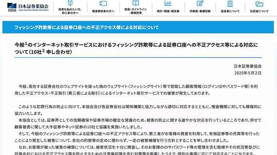 ゴールデンウィーク直前、にわかに証券会社界隈が騒がしくなった。5月2日に日本証券業協会(JSDA)が、「今般のインターネット取引サービスにおけるフィッシング詐欺等による証券口座への不正アクセス等による対応について(10社申し合わせ)」という発表を行った。