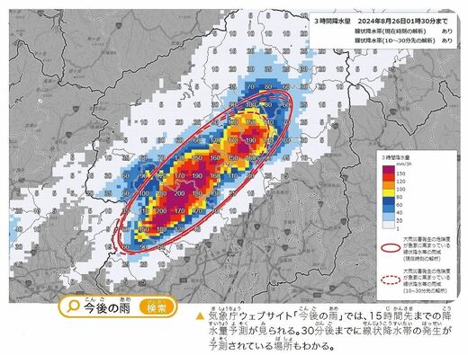 ひとつの積乱雲は1時間に数十mm程度の雨量の雨を降らせますが、積乱雲が連なった線状降水帯では雨量が100〜数百mmにもなる集中豪雨が起こることがあります。