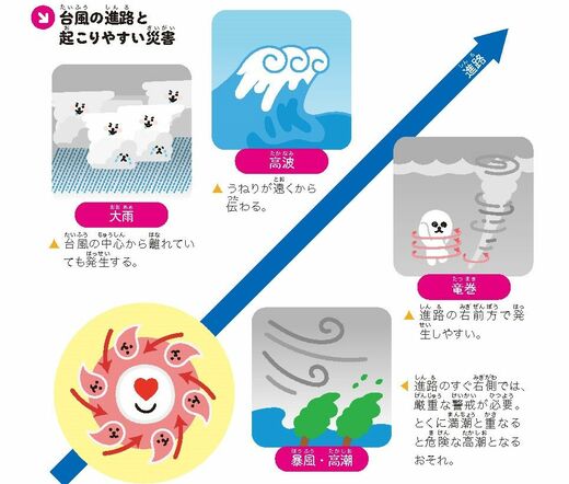 台風の進路と起こりやすい災害を知っておくことも備えになります。まず、台風が遠く離れていても影響するのは、海の波が高まる「高波」です。また、前線などの影響で台風が接近する前から大雨になることがあります。台風が近づいて雨雲がかかるようになると、進路の右前方で竜巻が発生しやすくなります。