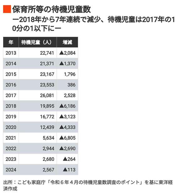 一方、保育所の待機児童は、ピークだった2017年から10分の1以下に減っている。2024年には全国で過去最少の2567人にまで減少しているが、学童保育の待機児童数は1万7686人と増加傾向にある。