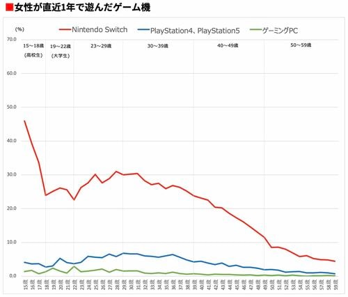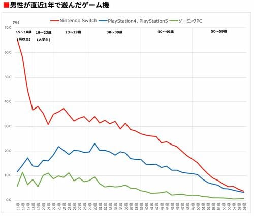 Nintendo Switchユーザーを年齢別の分布で見ていくと15歳から18歳に向けて、学校生活に受験や就職なども重なるからか急激に数字が落ちる傾向が見える。