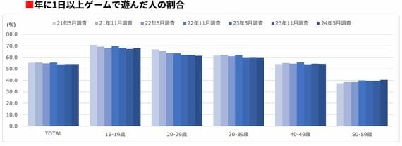 スマホ、家庭用、PCゲームのいずれかを年に1日以上遊んだ人の割合を見ると、2024年5月では54.0%で、その人口は3551万人と推計される。2021年5月調査時点では55.3%(推計3681万人)だったので、全体的な数字として微減となっている。