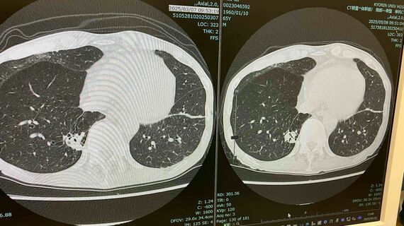 「左が3月、右が今回の画面です。左画像の左側にある星雲状の腫瘍が、右画像ではくっきりとした形になっています。そして左画像の右下にある楕円形の腫瘍が5月のほうが若干大きめで鮮明になっています。ただ、痰が集積してこういう状態に見えることもあり、腫瘍が大きくなったとは言い切れません」