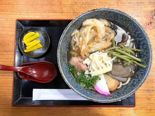 名物は「棚田そば・うどん」で、毎日トッピングが違うんですけど、春はわらびとかタケノコ、山菜など、地元で取れた山菜がたっぷり使われています。