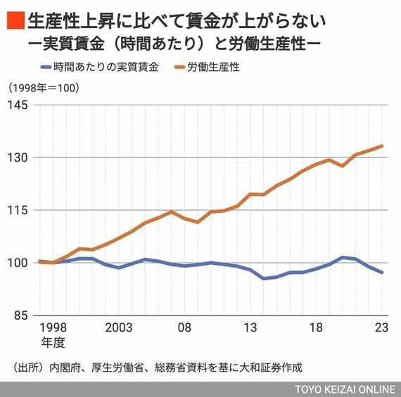 確かに、時間当たりの実質賃金と労働生産性の推移を見ると、労働生産性は年平均で約1%程度成長している一方、時間当たりの実質賃金は20年以上にわたり横ばい圏内で推移していることは事実である。
