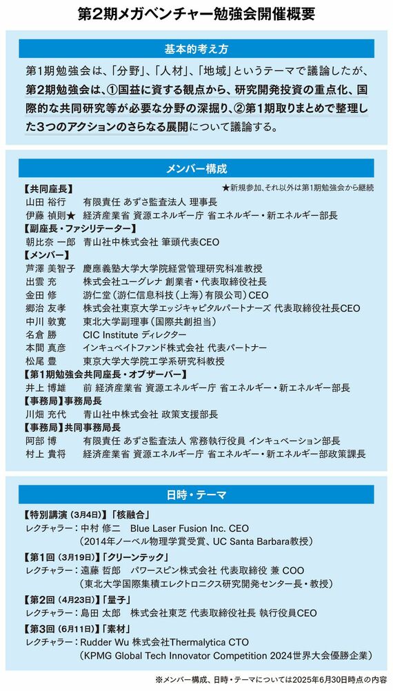 経済産業省・あずさ監査法人・青山社中が発足した官民連携による「メガベンチャー勉強会」は、2024年の第1期を終え、2025年の第2期はエネルギー分野のスタートアップを掘り起こし、成長軌道に乗せる具体的な活動をスタートさせている。