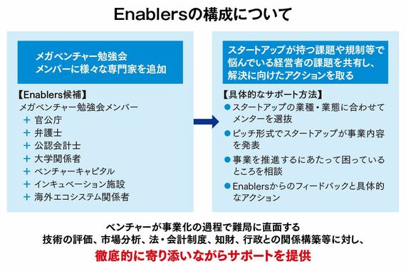 Enablersのメンバーは、民間の起業家をはじめ大学の研究者、政策に精通した官公庁職員、弁護士、海外ベンチャー市場の関係者など、幅広い分野の専門家で構成される。彼らは勉強会の既存メンバーに加わり、メガベンチャーを目指す事業の選定段階から議論に参加して、起業家の支援とベンチャーの成長に必要なリソースを提供する。