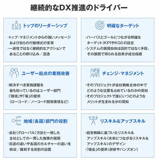 IBMは1990年代に巨額の赤字を出して以来、長年にわたり自社変革に取り組み、「変わることの難しさ」も経験してきた。その積み重ねの結果、AI活用を含む継続的なDXの推進には、前述のフレームワークにも通じる「トップのリーダーシップ」「明確なターゲット」「チェンジ・マネジメント」に加え、「ユーザー起点の業務改善」「地域(各国)部門の役割」「リスキル&アップスキル」という6つのドライバーが不可欠だと位置づけている。