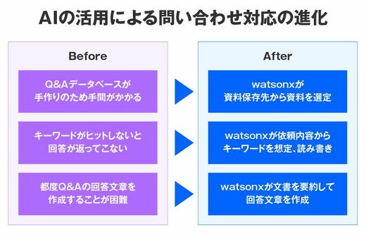 これに対し、23年に生成AI「watsonx(ワトソンエックス)」を導入したところ、状況は大きく改善。資料保存先からwatsonxが自動で最適な資料を選定し、それを要約して自然言語で回答を生成することが可能に。参照元URLも表示され、継続質問にも対応できるようになった。