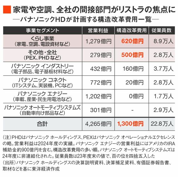パナソニックは国内で約8.1万人、海外で約12.6万人の従業員を抱える(2025年3月末時点)。今後行う経営改革では、2025年度を中心に国内と海外それぞれで約5000人ずつ削減する計画だ。従業員の5%がリストラの対象となる。
