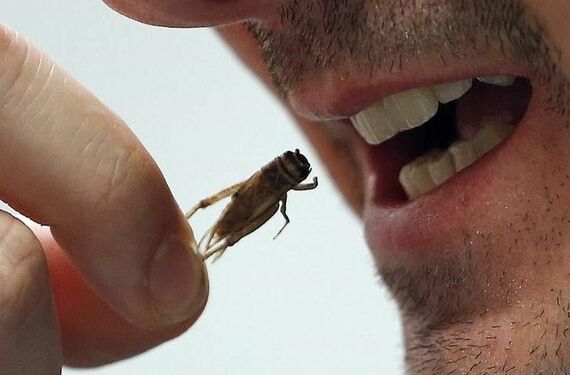 10月8日、欧州食品安全機関によると、イエバエやコオロギなどの昆虫は鶏肉、牛肉、豚肉などに代わる安全で栄養価が高く、環境にやさしい食品・飼料として利用できる可能性がある。写真は仏工場でコオロギを食べようとする従業員。昨年2月撮影(2015年 ロイター/Regis Duvignau)