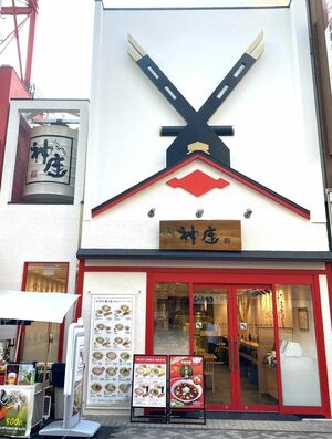 外観デザインにもこのコンセプトは反映されており、大阪の心斎橋店や道頓堀本店では、神社の鳥居形のモニュメントが屋根や玄関に飾られている。器などに入っているロゴ「KAMUKURA」のAも、鳥居の赤色だ。