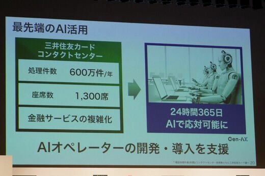 包括的な提携として、三井住友カードではソフトバンクのAI技術の活用も進める。三井住友カードはコンタクトセンターにソフトバンクと子会社のGen-AX(ジェナックス)社の「自律思考型AI」を導入し、3年後には年間600万件の問い合わせの過半をAIで対応する計画だ。これまでの「補助的」なAIから「自律的」なAIへの転換を目指す。