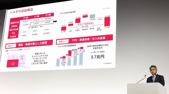 関税影響の緩和策について、佐藤恒治社長は「今いちばん大事なのはとにかく軸をぶらさずに、ジタバタせずしっかりと地に足をつけてやれることをやっていくことだ」と述べるにとどめる。宮崎洋一副社長も「短期で関税があるから値上げをするとか場当たり的な対応はとらない」と当面は静観する姿勢を示した。