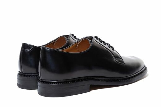 素材はイタリア・ロカド社のシェルコードバンを採用しており、タンニン鞣しで製造される同社のコードバンは特有のハリがありつつもなめらかな質感で経年変化を味わえる魅力があります。木型はつま先の厚さを抑え、幅にゆとりを持たせたラウンドシルエットを採用。それによりプレーントゥのスタイルにマッチするいい塩梅のカジュアルさを表現しています。