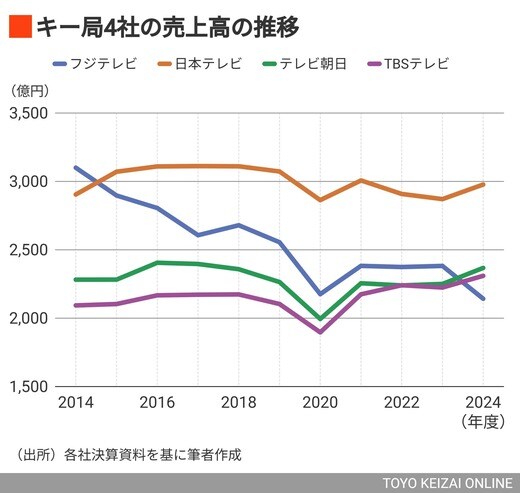 出そろった2024年度のキー局決算を振り返ると、各局単体の売上高は日本テレビが2977億円、テレビ朝日が2367億円、TBSテレビが2309億円、テレビ東京が1158億円、そしてフジテレビは2141億円だった。2014年度まではトップだったフジテレビがこの10年で坂を転げ落ちるように売上高を下げ続け、ついに4位になってしまった。