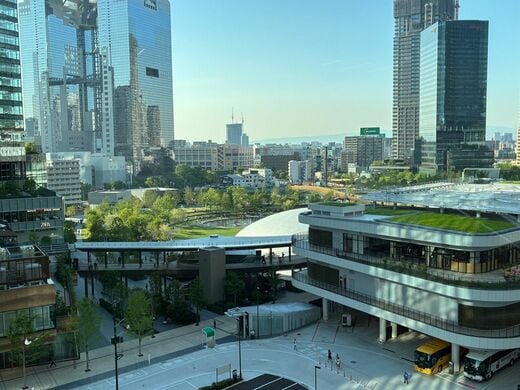 窓の外の風景。グラングリーン大阪の緑がまぶしい