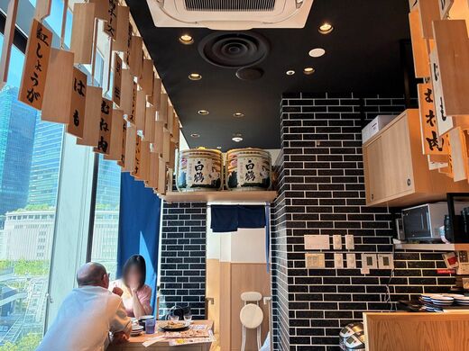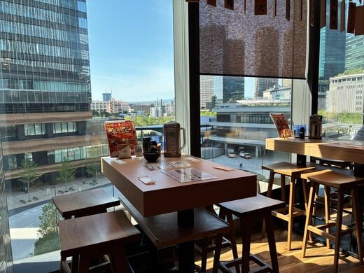 カウンター席を越えるとテーブル席があり、窓の外には、どんどん都会的になるウメキタエリアの“シュッとした”景色が広がっている。