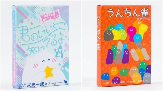 『君のいいとこ知ってるよ』(左)は2024年インディーズ作品。いいところカードを3枚、ひとりだけ4枚持っていて、多い1枚を誰かに渡し、渡されて4枚になった人がまた誰かに1枚渡す。これを続けて、カードがそろったら上がり。全員が上がるとクリアという協力ゲーム。『うんちん雀』(右)もタイトルから考えたゲーム。「うんこ」「ちんこ」みたいな小学生が喜びそうな言葉をつい言ってしまうゲームはできないかという発想で『うんとちん』というタイトルが浮かんだ